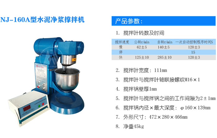 本機(jī)是貫徹GB1346-2001所規(guī)定的專用設(shè)備之一,是按JC/T729-2005主要技術(shù)參數(shù)制造的新型雙轉(zhuǎn)雙速凈漿攪拌機(jī)。是按標(biāo)準(zhǔn)規(guī)定的水泥和水混合后攪拌成均勻的試驗(yàn)用凈漿,供測定水泥標(biāo)準(zhǔn)稠度、凝結(jié)時(shí)間及制作安定性試塊之用,是水泥廠、建筑施工單位、有關(guān)專業(yè)院校及科研單位水泥試驗(yàn)室必備的,不可缺少的設(shè)備之一。